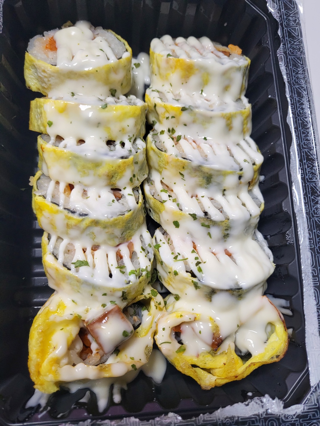 김밥인데 스팸이랑 볶음 김치가 들어있고 계란말이로 한번 더 감싸서 만든 김밥이에요!