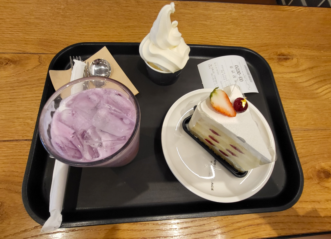 저는 그릭요커트 + 딸기 생크림 피스 + 소프트 아이스크림 먹었습니다!!