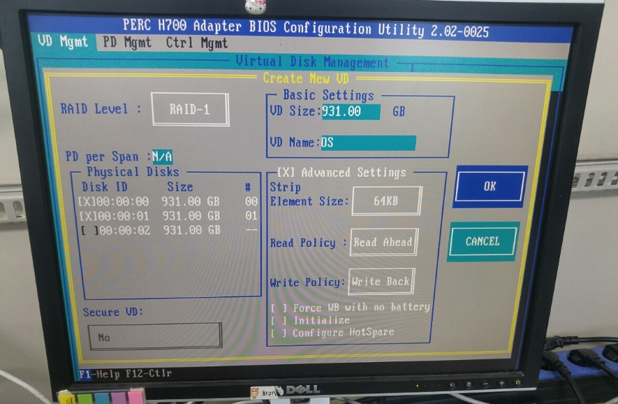 VD Mgmt의 Controller로 커서 이동 후, F2키, Enter키를 입력 후 Create New VD를 통해 신규로 구성 작업을 진행합니다.