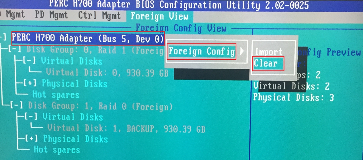 - PERC H700 Adater 부분에서 키보드 F2 입력 → Foreign clear