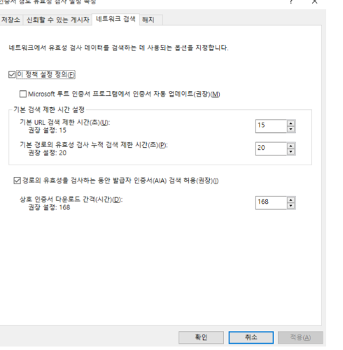 로컬보안정책 > 공개 키 정책 > 인증서 경로 유효성 검사 설정