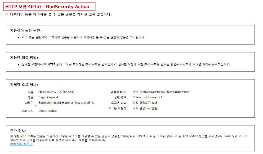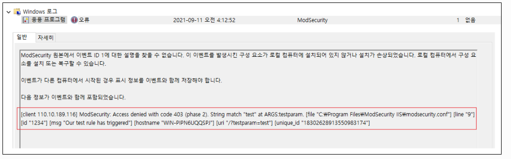 [ 추가 ] SecRule ARGS:testparam "@contains test" "id:1234,deny,status:403,msg:'Our test rule has triggered'"