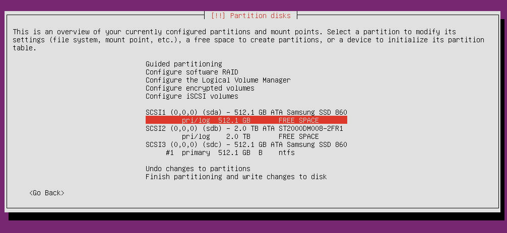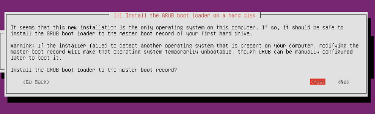 소프트웨어는 OpenSSH server만 선택한후 진행하신 후 GRUB 부트 로더를 마스터 부트 레코드에 설치할 것이지 묻는 창이 나옵니다 yes를 선택하고 엔터를 누릅니다.