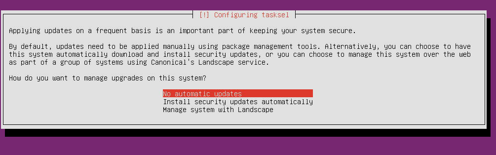 이제 자동으로 업데이트를 설정할 것이냐라고 물어보는데, 서버의 특성상 환경을 업데이트를 하면, 업데이트 후 재부팅이 될수 있기 때문에 이부분은 No automatic updates를 선택하여 자동 업데이트하지 않음을 선택합니다.