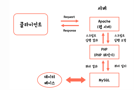컴퓨터 사용자 ( Clinet)가 인터넷 창에서 URL을 입력하여 원하는 정보를 서버에 요청하고, 서버의 Apache 프로그램 승인합니다. 이때 포트는 80번 포트로 웹서버로 요청하고 웹서버는 사용자에게 홈페이지 정보 ( HTML, CSS 등)를 날려줍니다. 사용자가 로그인 요청이나 다른 정보에 대한 요청을 하면 해당 정보를 제공하기 위해 웹서버는 PHP에게 스크립트 실행하기를 요청하고 PHP는 미리 작성된 프로그램을 통해 MySQL에 쿼리를 질의합니다 MySQL은 데이터베이스에 저장된 데이터를 가져와 PHP에 돌려주고 PHP는 데이터베이스에서 가져온 데이터와 PHP 코드를 모두 HTML 형태로 변경하고, 해당 HTML 파일을 Apache(웹 서버)에게 전송합니다. Apache는 완성된 HTML 파일을 클라이언트 측의 컴퓨터 웹 브라우저에 전달합니다.